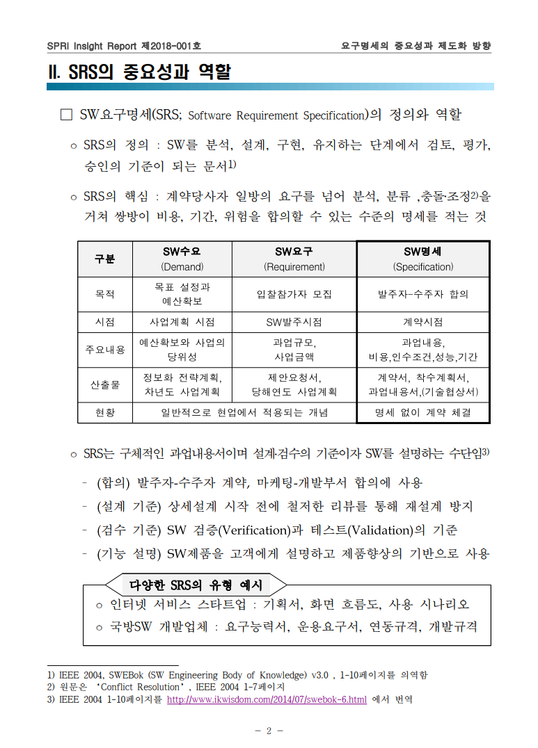 SRS(소프트웨어 요구 사양서, Software Requirement Specification) 요구분석 단계의 요구사항과 스펙을 정리한 산출물로써 소프트웨어 프로젝트의 중심이 되는 SW-요구사항 명세문서 개발 목적, 다양한 계
