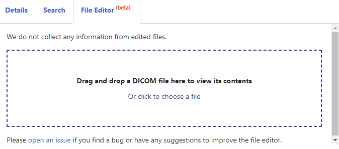 이 사이트에 장점이 있는 데 만약 우측 상단에 File Editor에 Dicom 파일을 드래그하여 넣게 되면 그 Dicom File의 Tag 값을 전부 분석해줍니다.